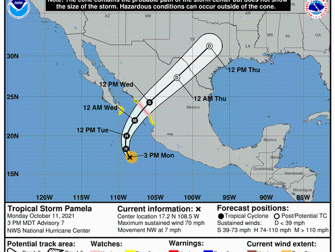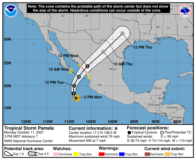 La tormenta tropical Pamela está a punto de convertirse en huracán categoría 1, y los pronósticos cada vez establecen que tocará tierra este miércoles a 20 kilómetros al norte de Mazatlán.