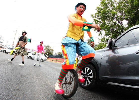 Payasos mazatlecos convirtieron en escenario el crucero de las avenidas Ejército Mexicano y Los Deportes, donde sacaron sonrisas e imprimieron humor a los conductores.