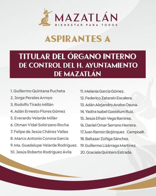 MAZATLÁN._ Dando cumplimiento a lo estipulado por la Ley de Gobierno Municipal del Estado de Sinaloa, la Sindicatura de Procuración del Ayuntamiento de Mazatlán, dio a conocer el listado de aspirantes a la titularidad del Órgano Interno de Control (OIC).