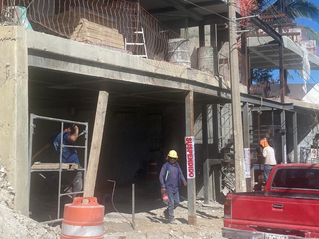MAZATLÁN._Vecinos del Cerro del Vigía denunciaron que a pesar de que la construcción de una torre de nueve pisos tienes sellos de suspensión, la obra sigue y hasta el Día de las Madres los trabajadores laboraron y no han parado.