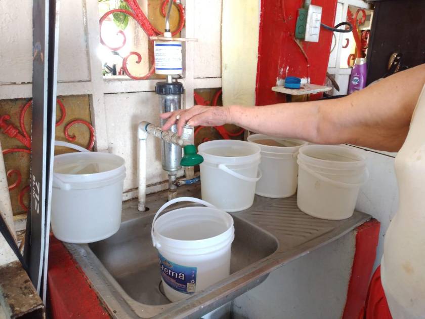 El restaurante de su vecina, Cleotilde Sánchez, está lleno de cubetas y trastes con agua, así la almacenan el rato que llega para poder lavar los trastes durante las horas en las que no tienen.