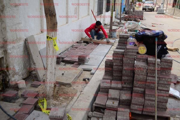 MAZATLÁN._ Aunque se anunció que se retirarían, las palmeras y luminarias continuaban ayer en la banqueta angosta de la Calle Niños Héroes, en el Centro Histórico, donde incluso hasta adoquín se comenzó a colocar.