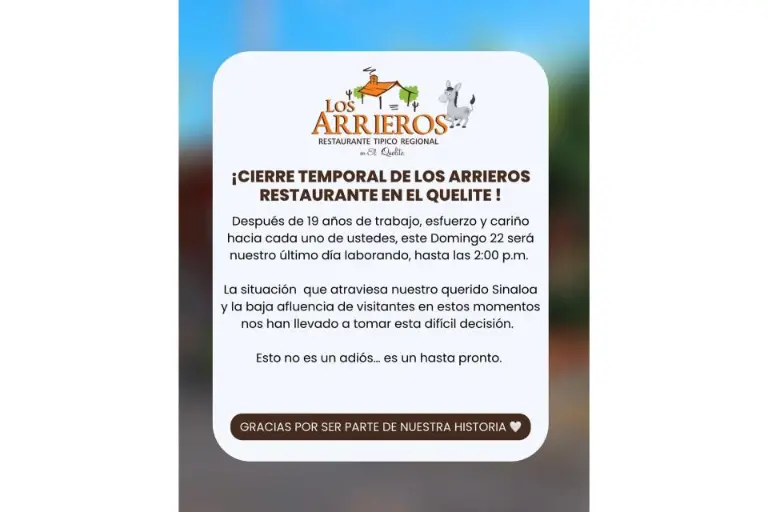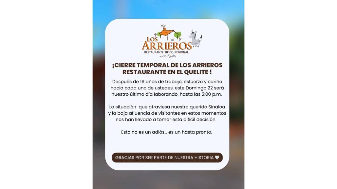 Los Arrieros, en El Quelite, de Marcos Osuna, con 19 años de tradición, anunció en su página oficial que el domingo 22 de febrero será su último día de atención.