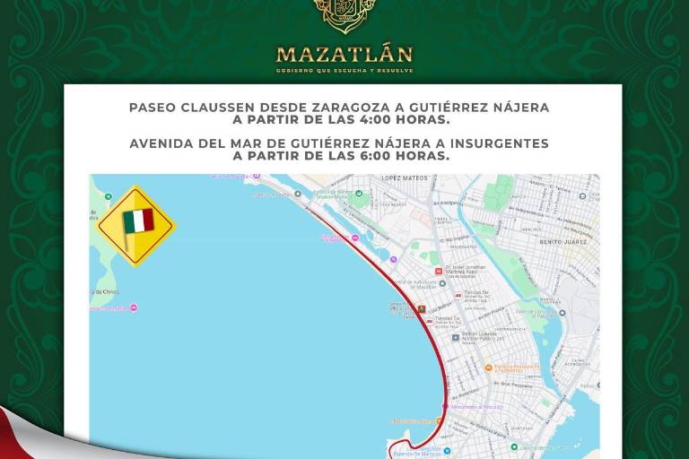 MAZATLÁN._ El desarrollo del desfile conmemorativo del 214 aniversario del inicio de lucha por la Independencia, se desarrollará este lunes 16 de septiembre desde las avenidas Zaragoza, Del Mar, Gutiérrez Nájera, hasta concluir en de los Deportes y Cruz Lizárraga.