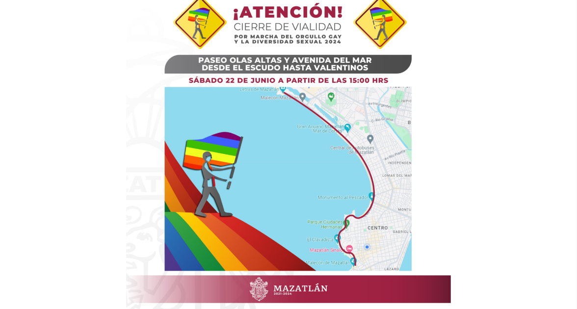 La Secretaría de Seguridad Pública a través de la Subdirección de Tránsito Municipal informa que debido a la marcha conmemorativa por la Diversidad Sexual, la Avenida del Mar, Paseo Claussen y Olas Altas serán cerrados a la circulación la tarde del Sábado.