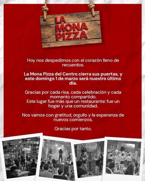 Este nuevo negocio del sector gastronómico que durante años representó una fuente de empleos, ingresos para el municipio y promoción como oferta de restaurantes de Mazatlán, anunció en su página oficial que con el corazón lleno de recuerdos, La Mona Pizza del Centro cerrará sus puertas el domingo primero de marzo.