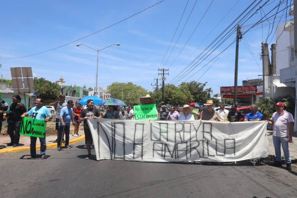 “Línea amarilla no es la solución”, “No a la línea amarilla”, “No al cierre de estacionamientos”, dicen en las pancartas de los manifestantes.