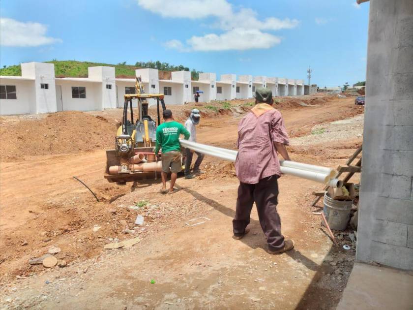Una maquina abre las zanjas para introducir las redes de agua potable y drenaje. Algunos trabajadores pintan de blanco los bloques con los que están construidas las casas, otros colocan las puertas y los muebles de baño.