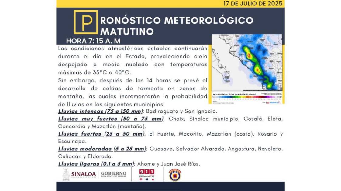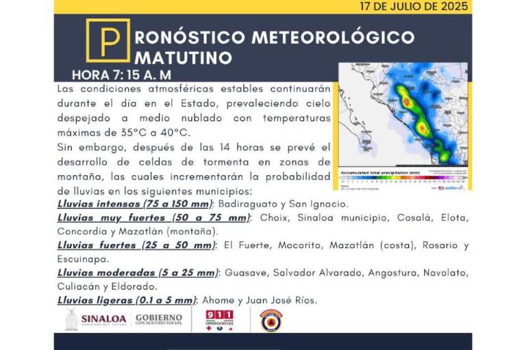”Los modelos predictivos climáticos para el Estado de Sinaloa refieren cielo despejado con temperaturas de 35 a 40 grados centígrados y con probabilidad de formación de celdas de tormentas para la tarde de este jueves 17 de julio”, se dio a conocer en un comunicado de prensa de la Secretaría de Seguridad Pública Municipal.