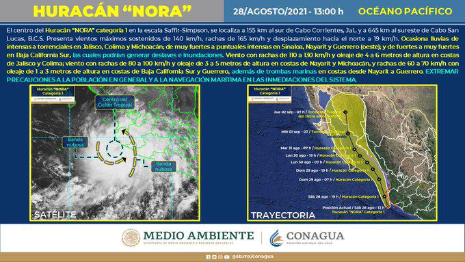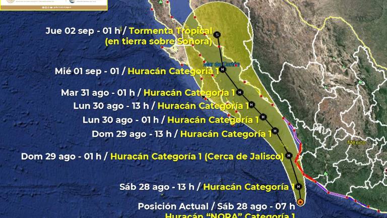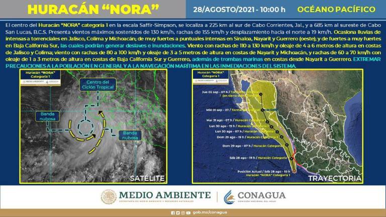 El huracán “Nora” de categoría 1 en la escala de Saffir-Simpson, cuyo centro localizó la tarde-noche de este sábado en tierra al suroeste de Cabo Corrientes, Jalisco, se prevé que cerca del mediodía de este domingo se encuentre a 45 kilómetros al suroeste de Mazatlán, Sinaloa.