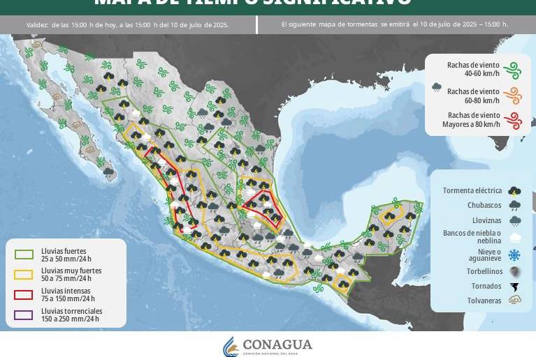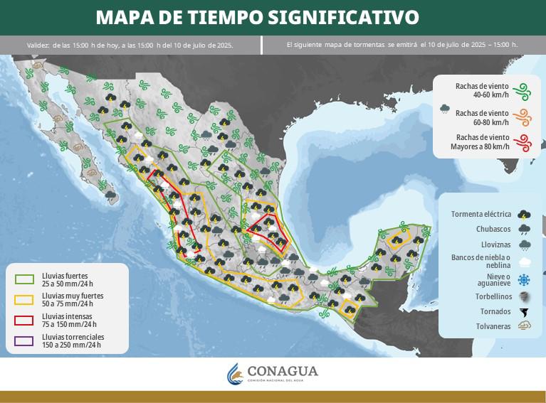 En este periodo se esperan lluvias fuertes con puntuales muy fuertes, de 50 a 75 milímetros, en Sonora, Chihuahua, Durango, Sinaloa y Nayarit.