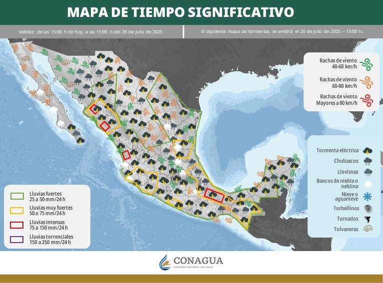 “El monzón mexicano sobre el noroeste de la República Mexicana, aunado a divergencia, generará lluvias puntuales intensas en Sinaloa (norte y centro) y Nayarit (centro); muy fuertes en Chihuahua y Durango; así como lluvias y chubascos en Baja California Sur y Sonora. Todas acompañadas con descargas eléctricas”, dio a conocer el organismo en su proyección meteorológica.