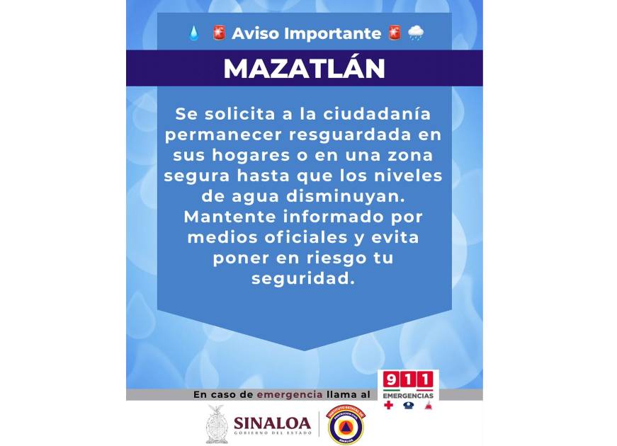 MAZATLÁN._ Ante la persistencia de lluvias intensas que podrían prolongarse hasta la madrugada de este viernes, la Coordinación Municipal de Protección Civil de Mazatlán emitió un llamado urgente a la ciudadanía para permanecer resguardada en lugares seguros y evitar transitar en zonas inundadas.