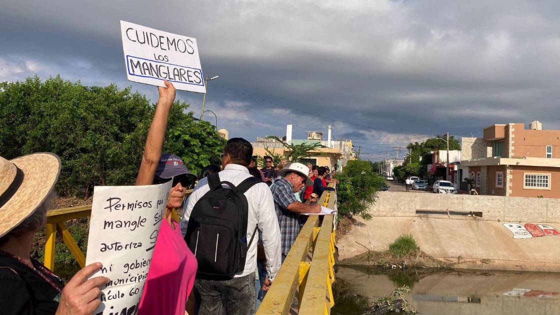 “No culpes al manglar, es el mal desarrollo lo que genera las inundaciones”, decía la manta que portaban los manifestantes en el lugar donde se vio que algunos mangles han sido cortados prácticamente hasta el ras del suelo.