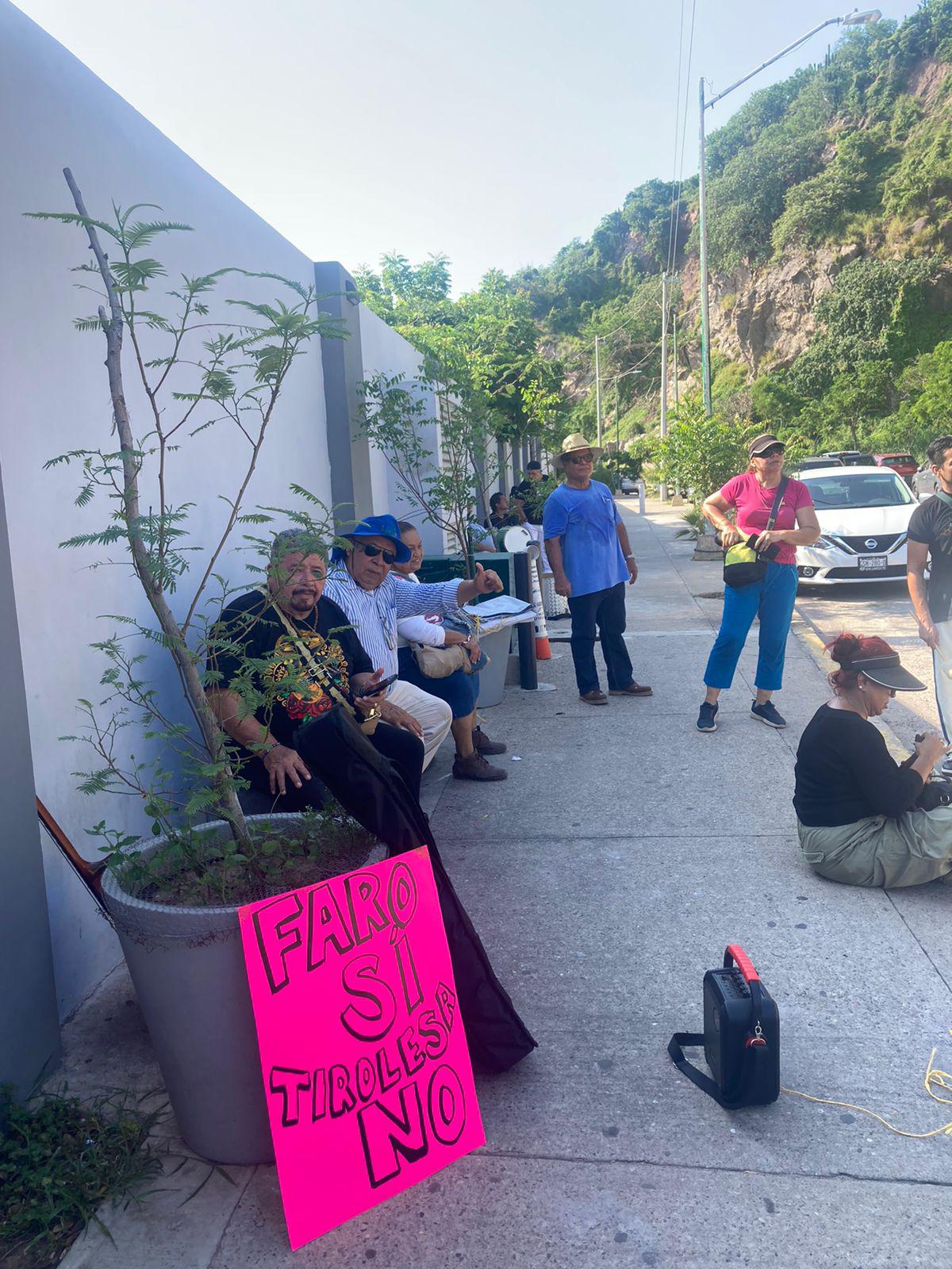 En punto de las 8:00 horas, manifestantes pertenecientes a colectivos en defensa del Faro y en defensa de los acceso de playas, acudieron a la entrada del cerro con pancartas y cartulinas que dejaban en claro su mensaje de protección a la flora y fauna endémica del Faro, ya que afirman que la tirolesa estará afectando a lo antes mencionado.