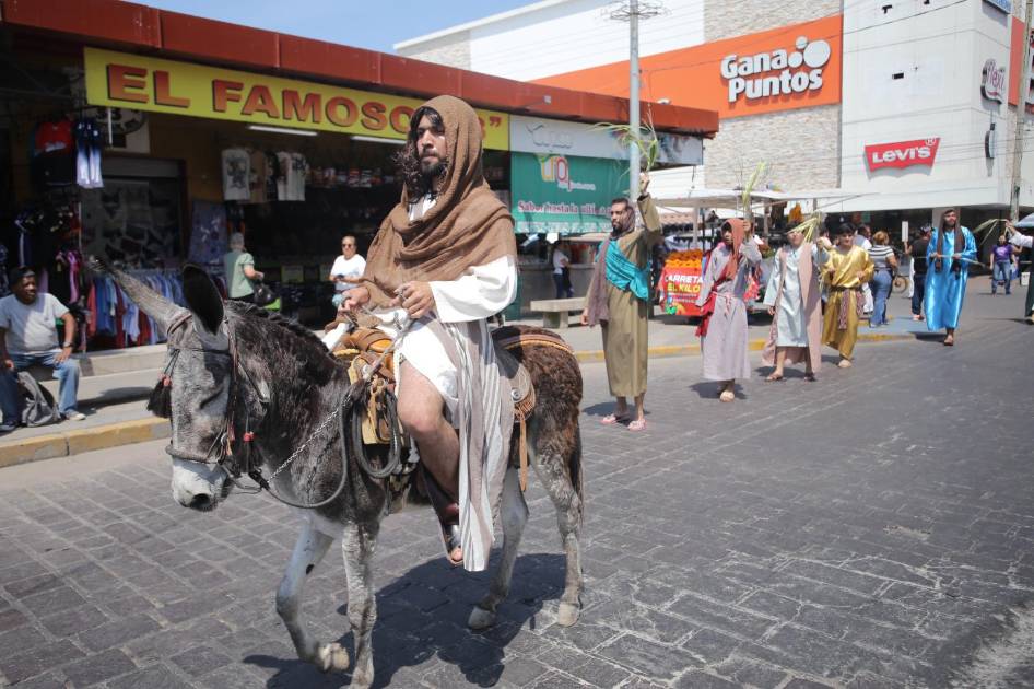 Montado sobre un burrito, el joven que encarnó a Jesucristo fue escoltado por decenas de feligreses en su marcha desde el Monumento al Pescador hasta la Catedral Basílica de Mazatlán. Durante el trayecto, los fieles ondeaban de arriba a abajo sus palmas para dar la bienvenida al Mesías.