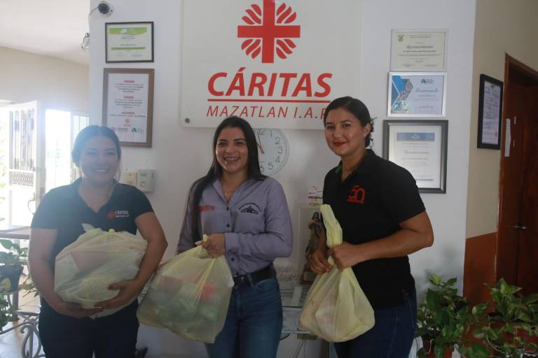 Por su parte Cáritas Mazatlán donó una despensa, que incluye leche, arroz, sopa, atún, pollo fresco, entre otros alimentos.