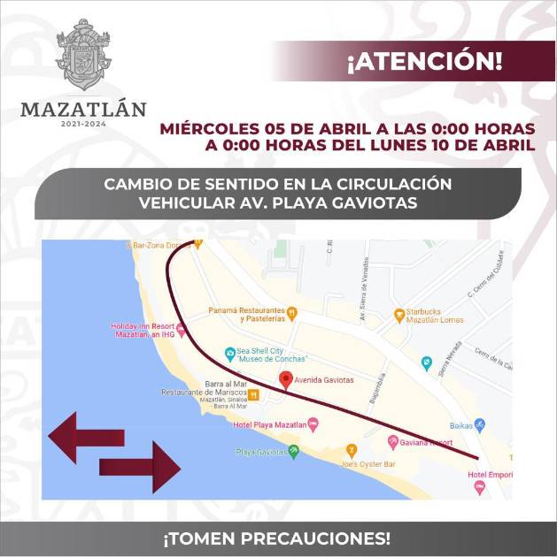 MAZATLÁN._ Recuerde que este miércoles 5 de abril y hasta el 9 del mes, la Avenida Gaviotas, en plena Zona Dorada, tendrá cambio de sentido vial. Por este periodo vacacional tendrá su circulación hacia el norte.