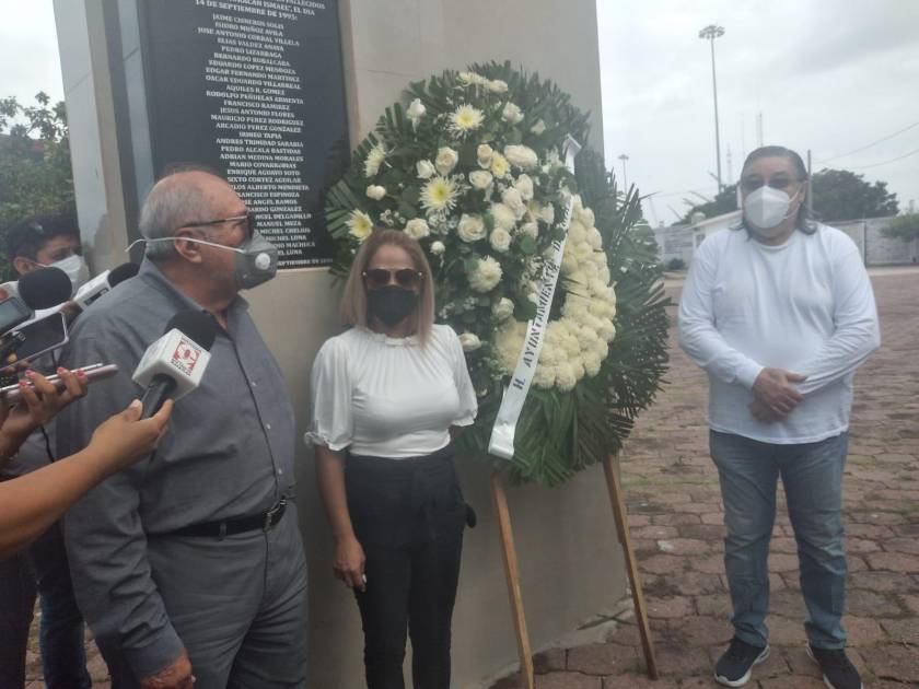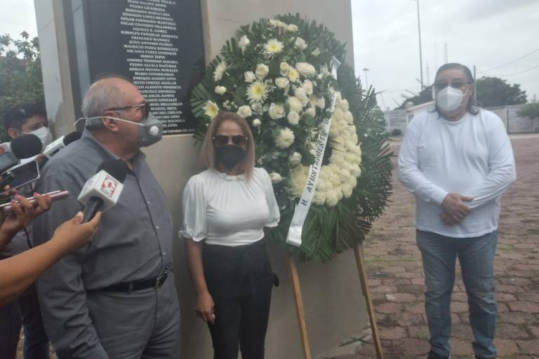 “Veintiséis años se dice fácil, pero sigue en la memoria de los mazatlecos que se unen a nuestro pueblo y a nuestra gente, 26 que fallecieron aproximadamente 30 pescadores solo de Mazatlán y nos duele mucho, por eso cuando me invitan a este evento siempre digo que sí, no venimos a una simulación, venimos porque nos nace”, dijo Benítez Torres en su mensaje al depositar la ofrenda floral en el Obelisco.
