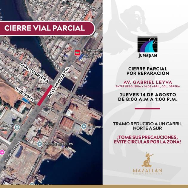 MAZATLÁN._ A partir de las 08:00 horas de este jueves 14 de agosto la avenida Gabriel Leyva será reducida a un solo carril la circulación vehicular de norte a sur, en el tramo de Pesqueira a 16 de Abril.