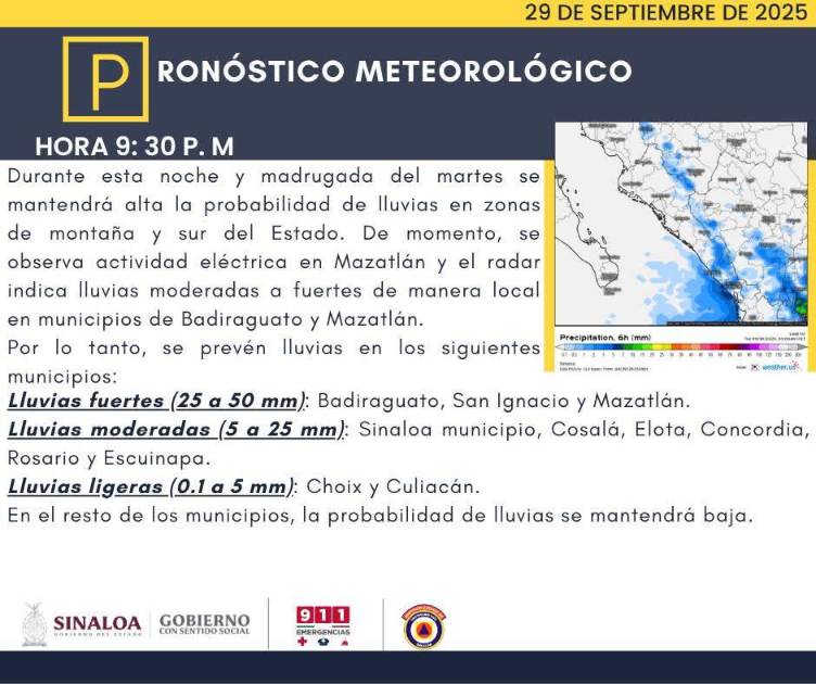 Durante el día el Coordinador Municipal de Protección Civil, Óscar Roberto Osuna Tirado, dio a conocer que para hoy se pronosticaban altas temperaturas de entre 34 a 38 grados en Mazatlán y lluvias de entre 5 a 25 milímetros o litros por metro cuadrado.