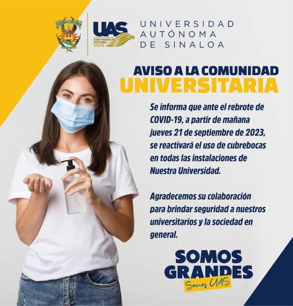 La Universidad Autónoma de Sinaloa informó a la comunidad universitaria que ante el rebrote del Covid-19, a partir de este jueves 21 de septiembre de 2023, se reactivará el uso de cubrebocas en todas las instalaciones de la Universidad.
