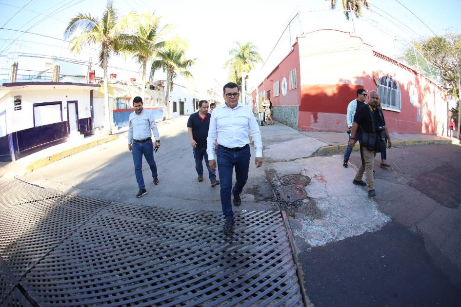 MAZATLÁN._ En un recorrido por la zona en donde se ubica el Colector Roosevelt, en la calle del mismo nombre esquina con Benito Juárez, en el Centro, el Alcalde Édgar González Zataráin junto a funcionarios de algunas direcciones del Ayuntamiento, supervisó los trabajos de rehabilitación del colector, lo cual incluye también el cambio de la red de drenaje que fue instalada hace más de 50 años.