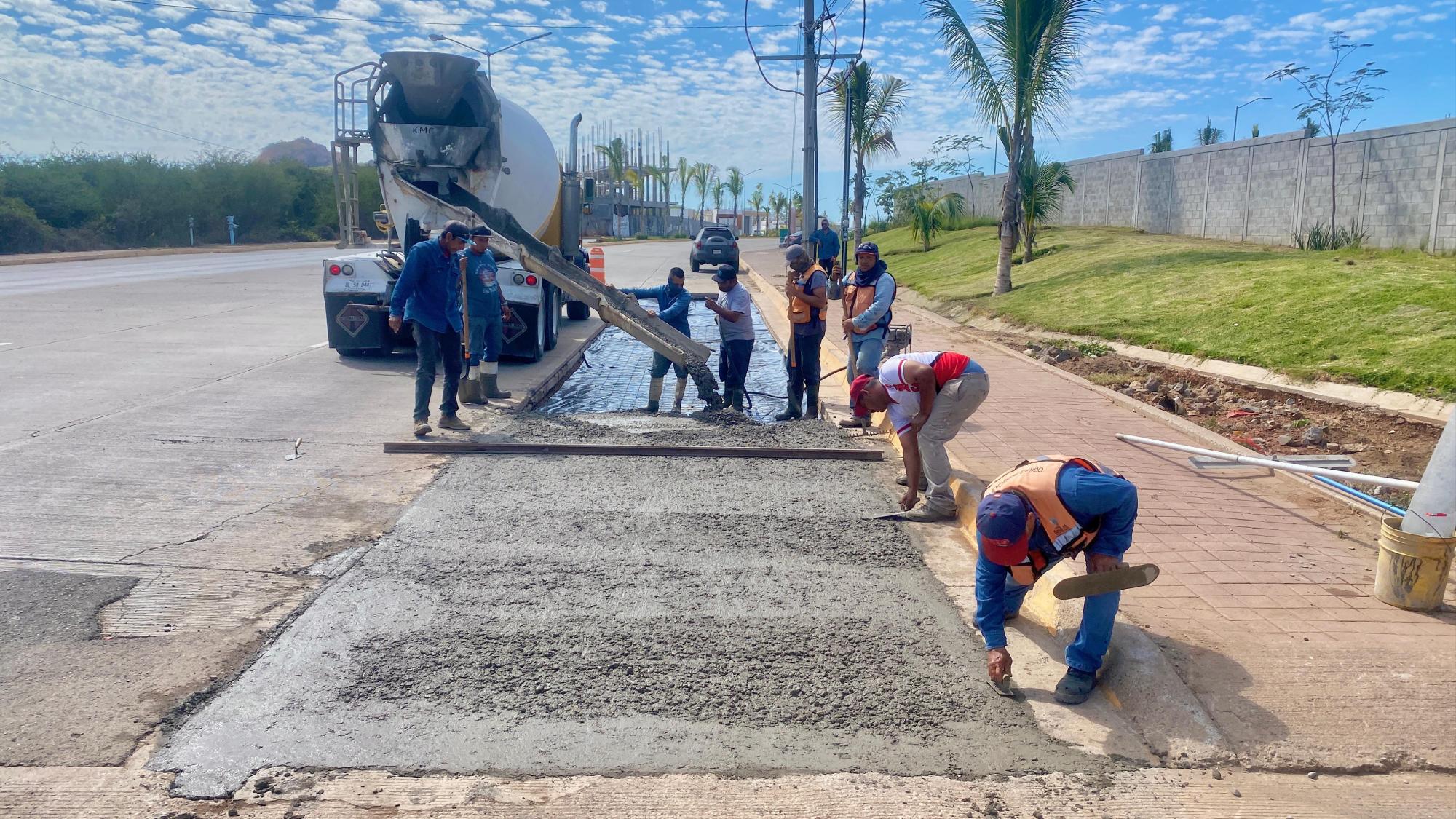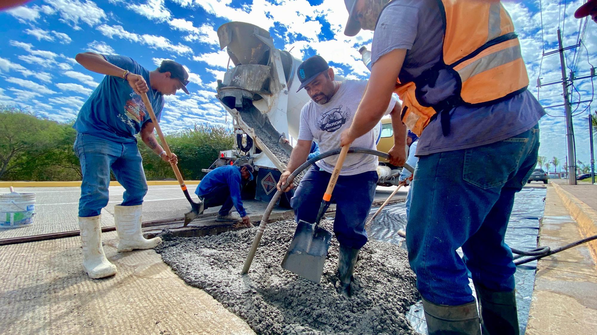 MAZATLÁN._ Tras la aparición de un socavón las losas de concreto de la Avenida Peche Rice se dañaron, por lo que personal de la Dirección de Obras Públicas acudió a reparar.