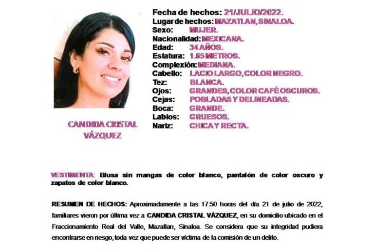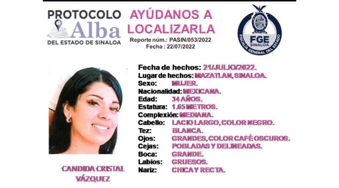 MAZATLÁN._ La Fiscalía General de Justicia de Sinaloa activó el Protocolo Alba por la desaparición de la comunicadora mazatleca Cándida Cristal Vázquez.