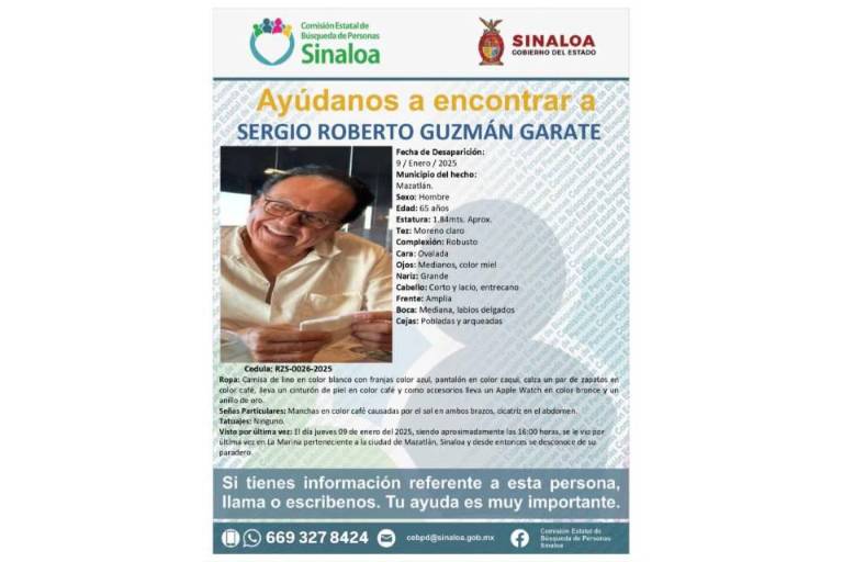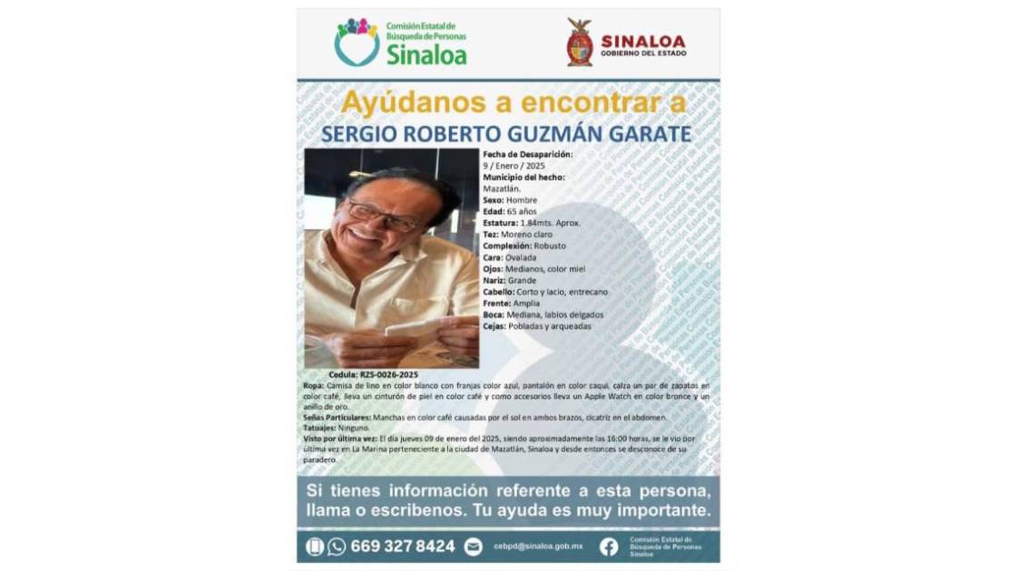 La última vez que fue visto Sergio Roberto Guzmán Gárate fue el pasado jueves 9 de enero en la zona de la Marina Mazatlán, a las 16:00 horas.