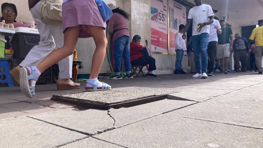El registro saltado se encuentra en una de las banquetas de la calle Benito Juárez, frente a la Catedral Basílica de la Inmaculada Concepción, lo que provoca que al ir observando el recinto, los peatones no vean el desperfecto, choquen contra él y tropiecen.