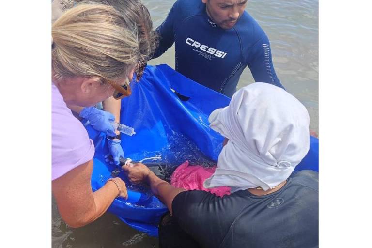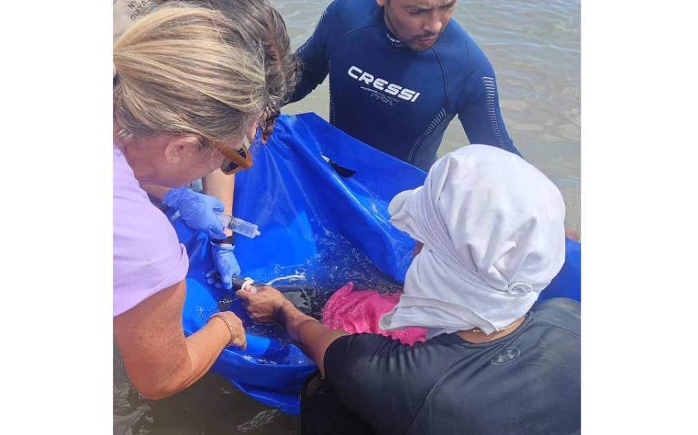 El segundo reporte ocurrió en playas de la Isla de Chivos. Una cría de delfín fue auxiliada por elementos salvavidas en coordinación con personal del Acuario.
