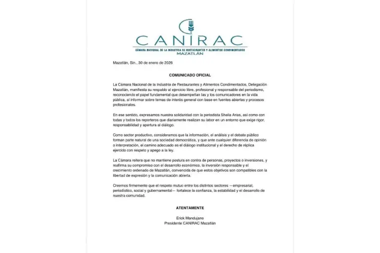 “La Cámara Nacional de la Industria de Restaurantes y Alimentos Condimentados, Delegación Mazatlán manifiesta su respaldo al ejercicio libre, profesional y responsable del periodismo, reconociendo el papel fundamental que desempeñan las y los comunicadores en la vida pública, al informar sobre temas de interés general con base en fuentes abiertas y procesos profesionales”, apuntó.