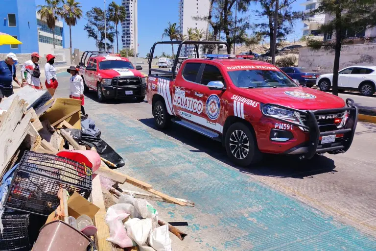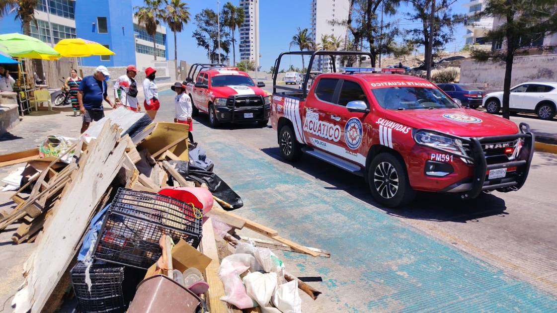 MAZATLÁN._ Con el objetivo de mantener espacios seguros y en óptimas condiciones para los visitantes, elementos del Escuadrón de Salvamento Acuático en coordinación con personal de Aseo Urbano realizaron una jornada de limpieza en el área de Playa Pinitos.