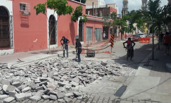 "Retiran empedrado de calle del Centro Histórico de Mazatlán... después de instalarse"