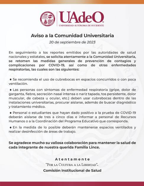 A través de un comunicado, la UAdeO informó este miércoles 20 de septiembre que a partir de este jueves 21 y en seguimiento a los reportes emitidos por las autoridades de salud nacionales y estatales, se solicita atentamente a la Comunidad Universitaria, se retoman las medidas generales de prevención de contagios y complicaciones por COVID-19, así como de otras enfermedades respiratorias.