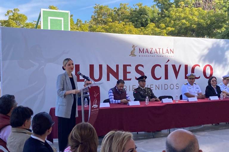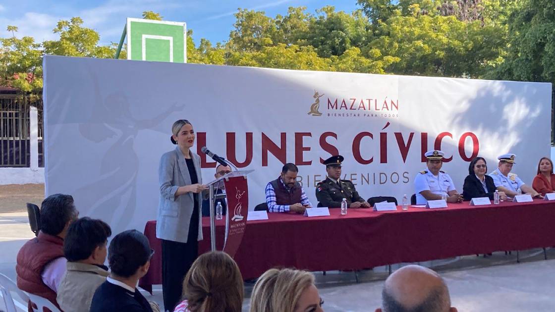 MAZATLÁN._ A petición de la comunidad escolar, la Alcaldesa, Estrella Palacios Domínguez se comprometió a construir las gradas en una de las techumbres de la escuela primaria “Gilberto Soto Velázquez”, ubicada en el fraccionamiento Valle Bonito, tras encabezar el Lunes Cívico en este plantel.