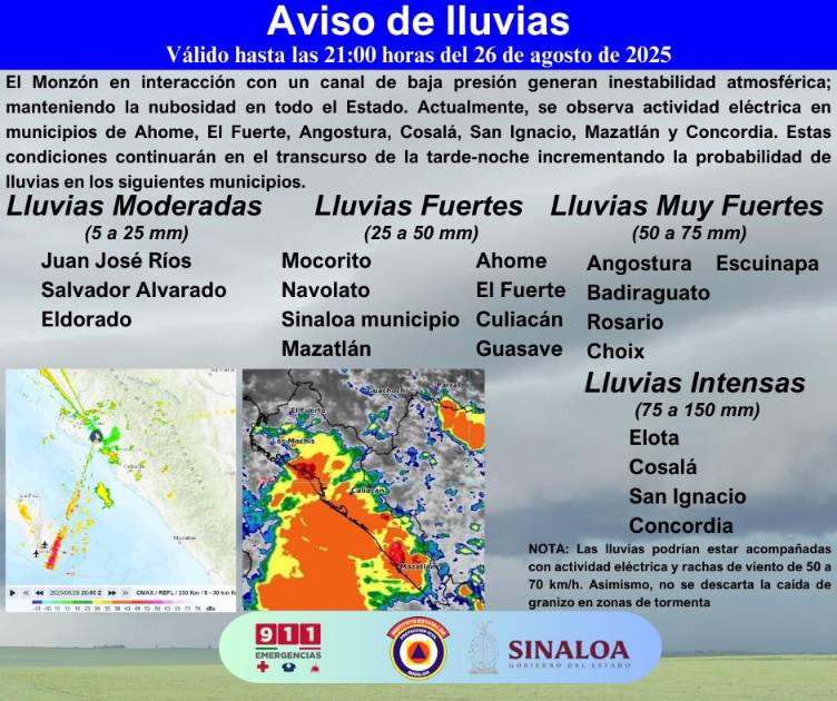 Por su parte el Coordinador Municipal de Protección Civil, Óscar Roberto Osuna Tirado, dio a conocer que la interacción del canal de baja presión y el monzón mexicano mantienen alta la probabilidad de lluvias en la región durante la tarde-noche de este martes, de acuerdo con los modelos de pronóstico.