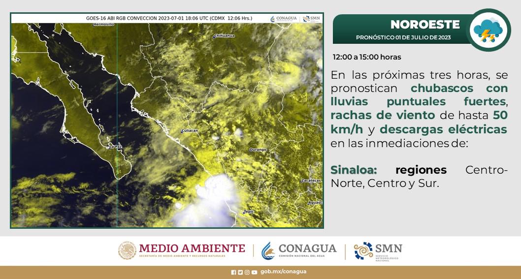 Durante este sábado se mantendrá la probabilidad de lluvias puntuales intensas en Nayarit, Jalisco y Colima, así como rachas fuertes de viento y oleaje elevado en zonas costeras; dichas condiciones disminuirán gradualmente durante la tarde-noche de este sábado, continuó.