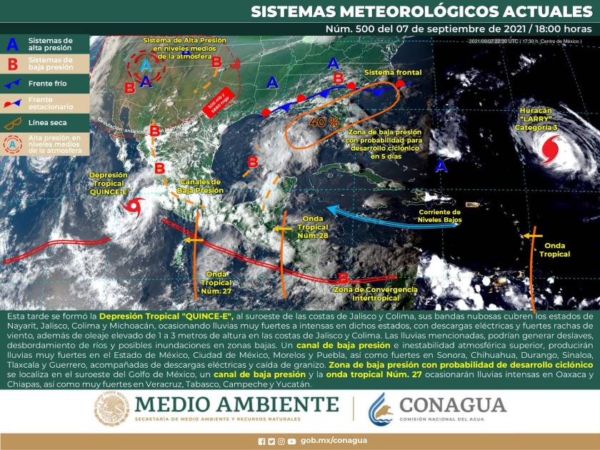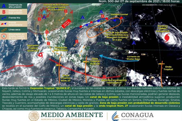 Para este miércoles la depresión tropical 15-E o posible tormenta tropical Olaf se localizará frente a las costas de Jalisco, su amplia circulación interaccionará con el paso de la onda tropical 27 que recorrerá el centro, sur y occidente del territorio nacional, además de inestabilidad atmosférica superior, ocasionando lluvias fuertes a muy fuertes con descargas eléctricas y posibles granizadas en el noroeste, occidente, centro y sur del país, incluido el Valle de México.