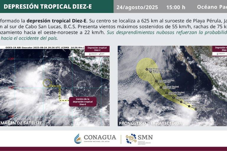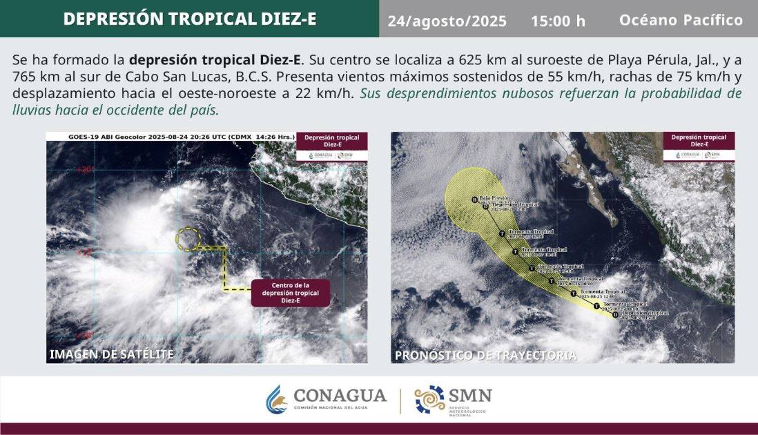 MAZATLÁN._ La tarde de este domingo se formó la depresión tropical 10-E frente a las costas de Jalisco y Colima y se pronostica que durante la madrugada de este lunes 25 de agosto se intensifique a tormenta tropical, en el Océano Pacífico, de acuerdo con el Servicio Meteorológico Nacional de la Comisión Nacional del Agua.