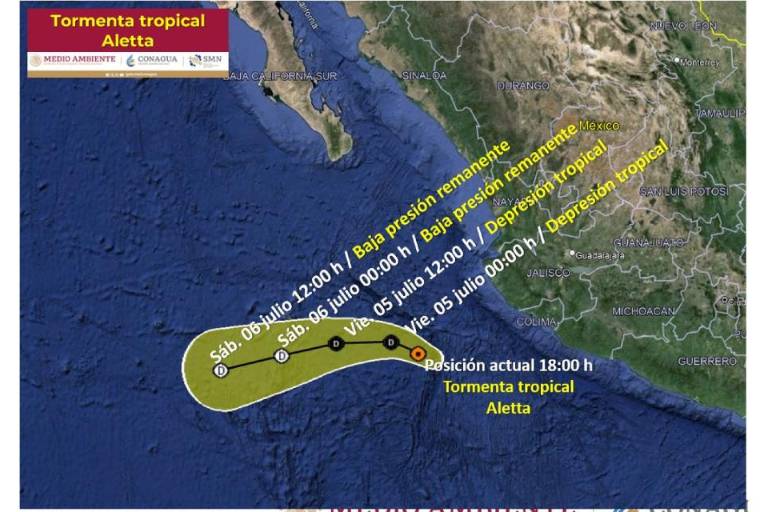 La depresión tropical Uno-E se intensificó para formar la tarde de este jueves la primera tormenta tropical en el Océano Pacífico, que lleva por nombre Aletta y se pronostica que su trayectoria es mar adentro, de acuerdo con el Servicio Meteorológico Nacional de la Comisión Nacional del Agua.