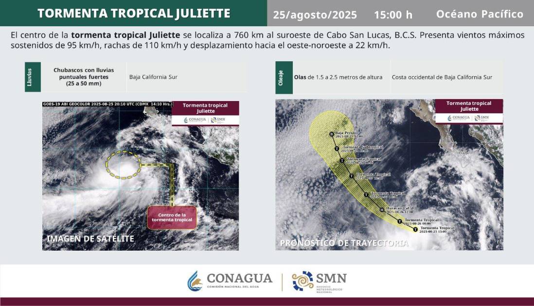 También pronosticó que para las 12:00 horas de este martes 26 de agosto Juliette se intensificará a huracán de categoría 1 en la escala de Saffir-Simpson, por la velocidad de sus vientos, y a esa hora se localizará a 825 kilómetros al suroeste de Cabo San Lázaro, BCS.