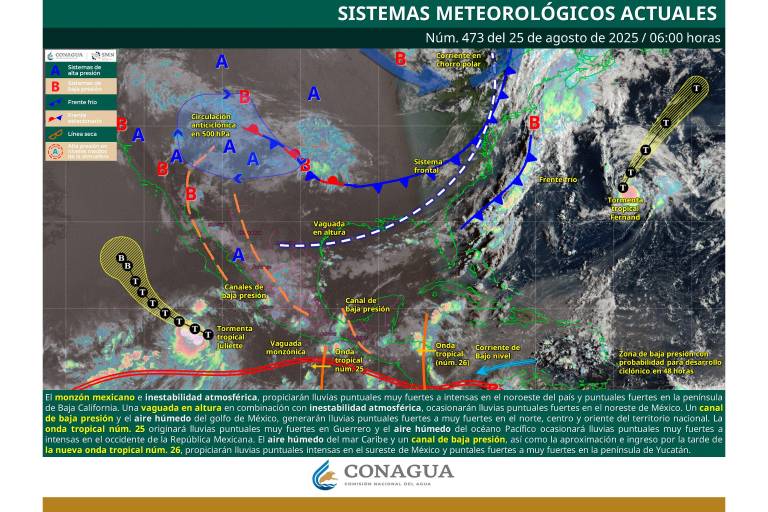 Para este lunes el SMN pronosticó lluvias fuertes a puntuales intensas, de 75 a 150 milímetros o litros por metro cuadrado para en centro y sur de Sinaloa generadas por el montón mexicano en combinación con una inestabilidad atmosférica.