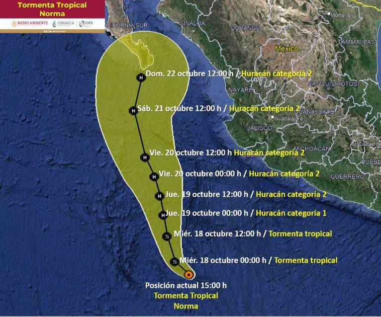 El sábado, “Norma” continuará aproximándose a Baja California Sur, su circulación generará probabilidad de lluvias puntuales torrenciales en dicho estado, lluvias intensas en Sinaloa, así como lluvias fuertes en Sonora, Durango, Nayarit y Jalisco, además de rachas fuertes de viento y oleaje elevado en las costas de Baja California Sur, Sinaloa, Nayarit y Jalisco.El domingo estaría atravesando el sur de Baja California Sur, para llegar al Golfo de California y enfilarse como huracán categoría 2 frente a las costas de Sinaloa.