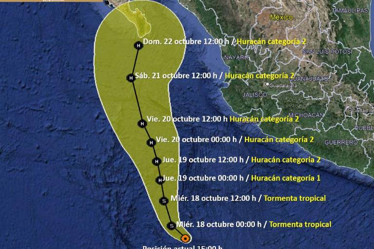 El viernes seguirá avanzando como huracán categoría 2 y se desplazará frente a las costas de Colima y Jalisco, con trayectoria hacia Baja California Sur, sus desprendimientos nubosos originarán probabilidad de lluvias fuertes a muy fuertes en dichas entidades, además de Michoacán, así como rachas fuertes de viento y oleaje elevado en las costas de Baja California Sur, Sinaloa, Nayarit, Jalisco, Colima y Michoacán.