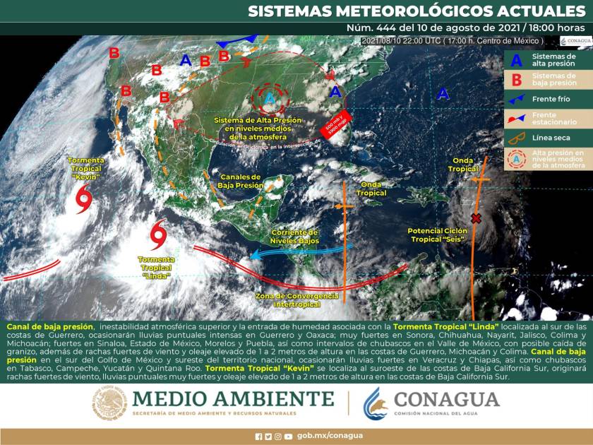 Mientras que la tormenta tropical “Kevin” se localizó a las 16:00 horas de este martes, tiempo del centro del país, a 720 kilómetros al suroeste de Cabo San Lucas, BCS, con desplazamiento hacia el noroeste a 15 kilómetros por hora, con vientos sostenidos de 85 kilómetros por hora y rachas de 100 kilómetros por hora.