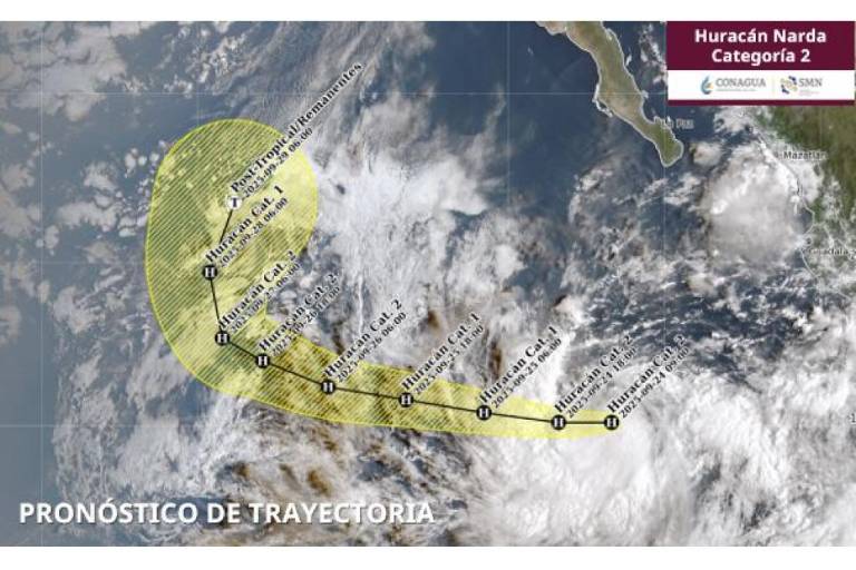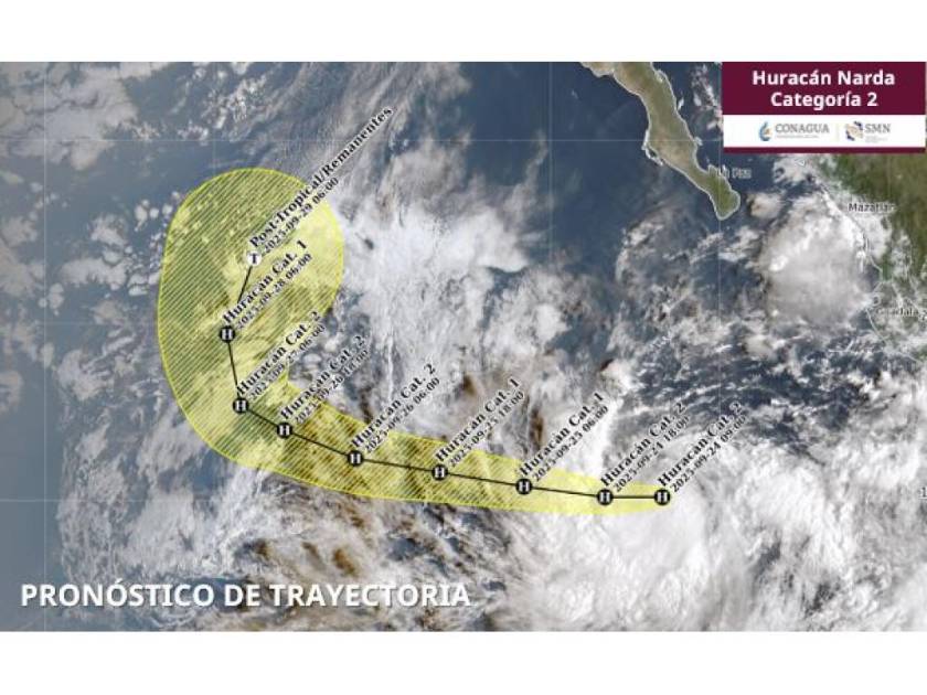 ”Narda se encuentra actualmente a 855 kilómetros al suroeste de Playa Pérula, Jalisco, y a 885 kilómetros al sur-suroeste de Cabo San Lucas, se desplaza a una velocidad de 20 kilómetros por hora hacia el oeste, no representa ningún peligro para lo que son las costas nacionales, sus efectos sí podrían sentirse debido a los desprendimientos nubosos que podría tener este ciclón tropical”, añadió Torres Alarcón en entrevista.