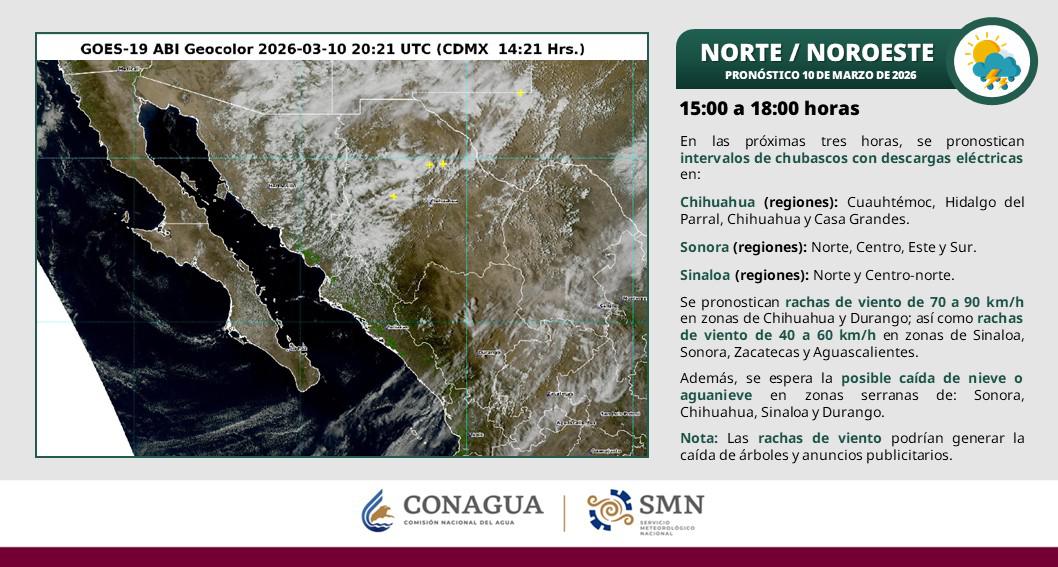 “La Cuarta Tormenta Invernal se desplazará sobre Sonora y Chihuahua, en interacción con la corriente en chorro subtropical, generarán ambiente frío, vientos fuertes a muy fuertes, lluvias y chubascos en dichas entidades, además de Sinaloa y Durango”, añadió el SMN en su proyección meteorológica de las 8:00 horas de este martes a las 8:00 horas de mañana miércoles 11 de marzo.
