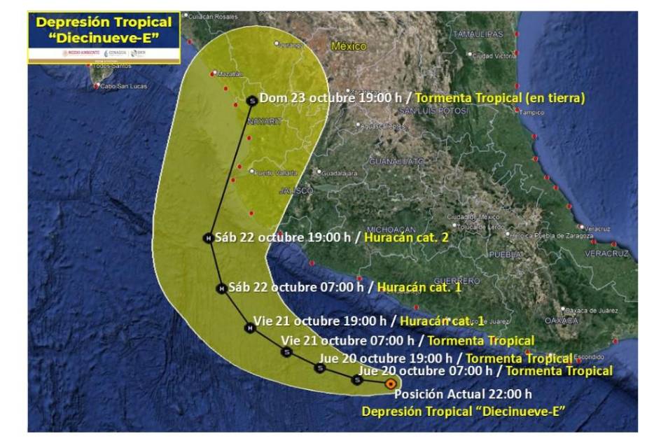 La Conagua informó en su aviso 01 de las 21:15 horas (horario de Sinaloa) de este miércoles que se formó la Depresión Tropical “Diecinueve-E” al sur de Guerrero y se prevén que este jueves aumente su potencial y se convierta en tormenta tropical y el viernes por la tarde-noche suba a huracán categoría 1 y el sábado ya sea huracán categoría 2, enfilándose a las costas de Nayarit.